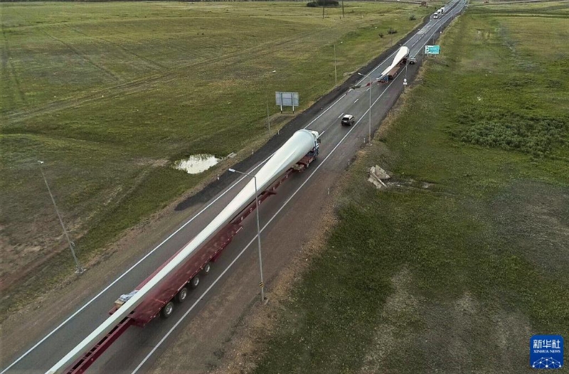 2020年6月23日,在哈薩克斯坦卡拉干達(dá)至努爾蘇丹段公路,卡車車隊(duì)運(yùn)輸70米長(zhǎng)的風(fēng)機(jī)葉片(無(wú)人機(jī)拍攝)。新冠疫情期間,中國(guó)和哈薩克斯坦克服困難,繼續(xù)推動(dòng)新能源領(lǐng)域合作。中國(guó)生產(chǎn)的風(fēng)電設(shè)備跨越數(shù)千公里運(yùn)輸至哈薩克斯坦,助力哈薩克斯坦可再生能源項(xiàng)目。新華社發(fā)(奧斯潘諾夫攝)