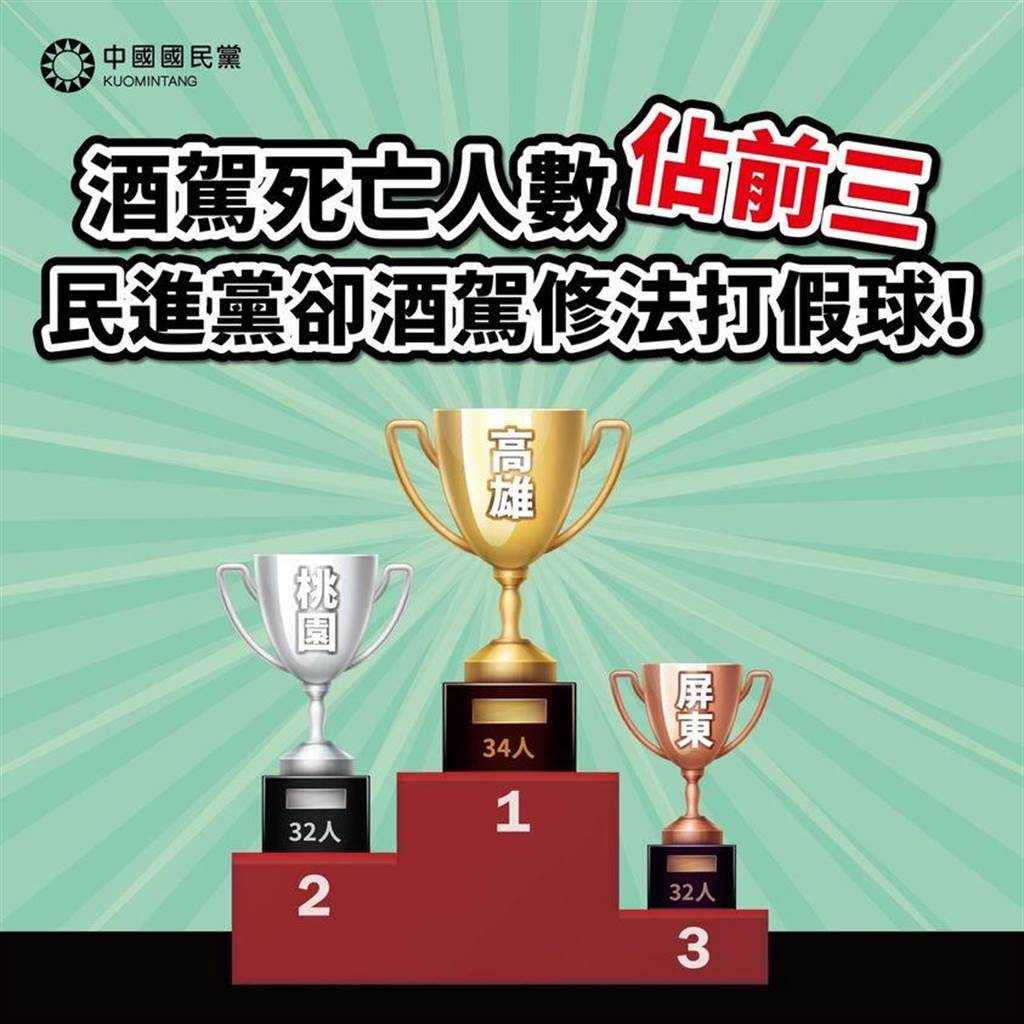 國(guó)民黨表示,其中,酒駕死亡人數(shù)最多的縣市是高雄市,竟多達(dá)34人,甚至較前一年同期增加了11人之多,是全臺(tái)最多,而桃園市、屏東縣等綠營(yíng)執(zhí)政縣市的酒駕死亡人數(shù)也高達(dá)32人,與高雄名列全臺(tái)酒駕死亡人數(shù)最多的前3名。