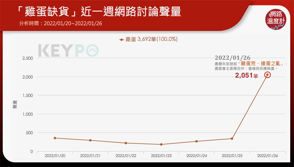 雞蛋話題持續(xù)發(fā)燒,透過《KEYPO大數(shù)據(jù)關(guān)鍵引擎》調(diào)查(2022/01/20~2022/01/26)統(tǒng)計調(diào)查,雞蛋荒話題熱度持續(xù)攀高,1月26日討論度一口氣沖到2051筆,網(wǎng)友話題聚焦在“蛋荒、蛋價、搶蛋”,從趨勢圖上可以清楚看見,越接近農(nóng)歷過年,雞蛋話題越趨明顯,26日沖上一波高峰。
