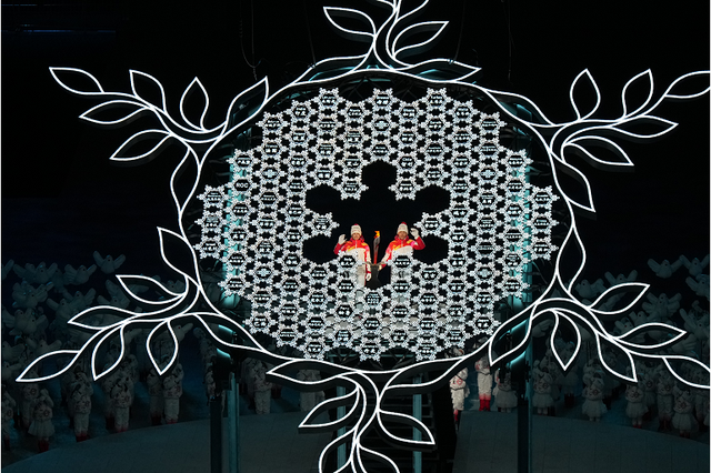 所有的引導(dǎo)員高舉各參賽國(guó)家(地區(qū))名的雪花引導(dǎo)牌,通過(guò)舞蹈與地面光影的互動(dòng),讓所有雪花聚合,共同構(gòu)建成一朵大雪花。