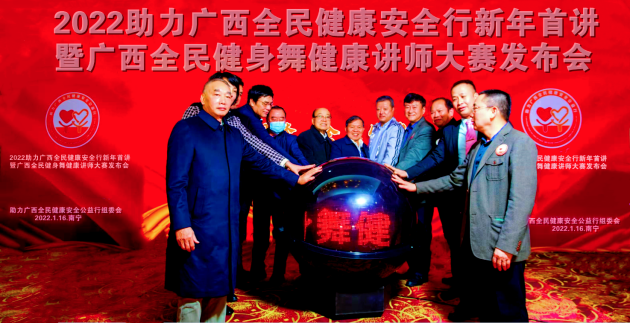 2022廣西全民健身舞健康講師大賽啟動,廣西自治區(qū)政協(xié)原副主席潘鴻權、廣西自治區(qū)發(fā)改委原主任章遠新、廣西醫(yī)科大學原校長黃光武、國家衛(wèi)生部辦公廳原秘書鄭巖、美國杜爾生命科學研究院院長于釗、美國醫(yī)學領域杰出專家王長峰、廣西自治區(qū)體育局原社體中心主任黃金權、廣西區(qū)政府辦公廳原秘書陳作軍、中外抱團網(wǎng)主席鄭點、廣西抗衰老科學技術學會常務副會長梁啟成、藍正(深圳)醫(yī)療科技有限公司董事長宋麗杰、廣西醫(yī)科大學專家陳宏剛共同按啟動球