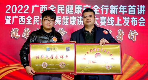 玉林倍鮮商貿(mào)有限公司董事長黃敏豪獲得第一時間健康安全服務站玉林運營中心和特許基因采樣點授權