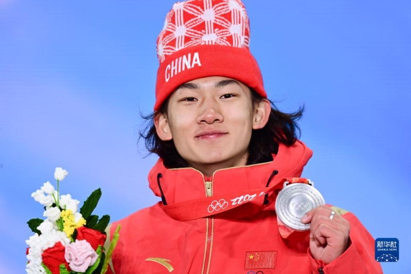 2月7日,亞軍中國選手蘇翊鳴在北京2022年冬奧會(huì)單板滑雪男子坡面障礙技巧獎(jiǎng)牌頒發(fā)儀式上。新華社記者張宏祥攝