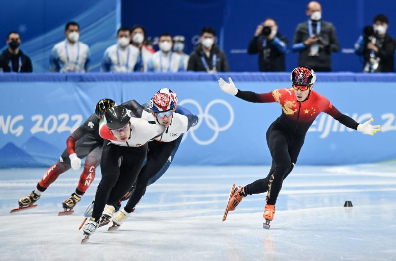 2月9日,中國選手任子威(右一)在北京冬奧會(huì)短道速滑男子1500米半決賽中。新華社記者李尕?cái)z