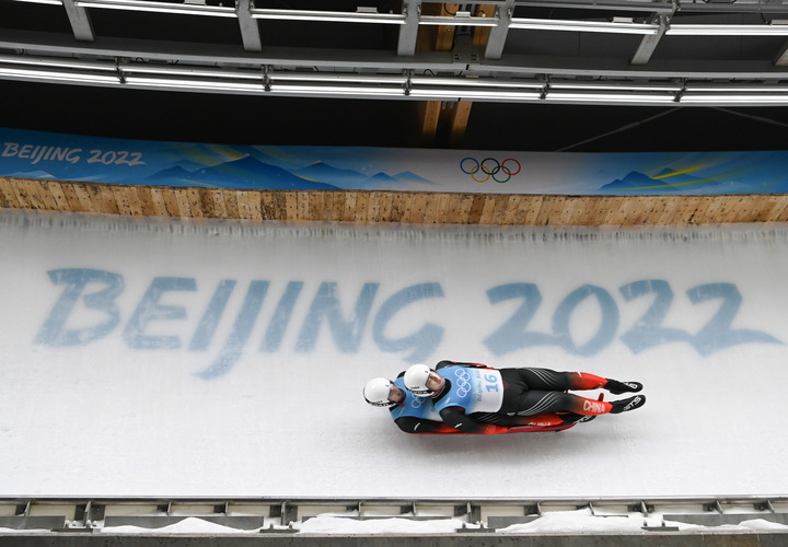 2月9日,中國選手黃葉波和彭俊越在北京2022年冬奧會雙人雪橇項目比賽中。新華社記者孫非攝
