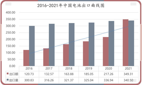 四、2016-2021年中國電池出口曲線圖(出口額單位:億美元;出口量單位:億只)