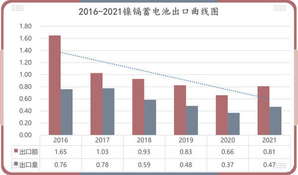 3、2016-2021年鎳鎘蓄電池出口曲線圖(出口額單位:億美元;出口量單位:億只)