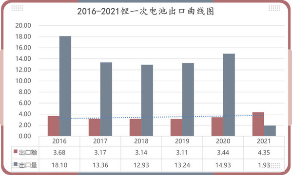 1、2021年鋰一次電池出口量為19.27億只,2020年出口量為14.93億只,與上一年相比,同比上漲了29.07%。2021年鋰一次電池出口額為4.35億美元,2020年出口額為3.44億美元,與上一年相比,同比上漲了26.45%。