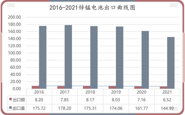 1、2021年鋅錳電池出口量為144.99億只,2020年出口量為161.77億只,與上一年相比,同比下降了10.37%。2021年鋅錳電池出口額為6.52億美元,2020年出口額為7.16億美元,同比下降了8.94%。