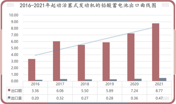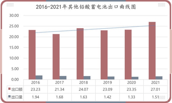 3、2016-2021年起動用鉛酸蓄電池出口曲線圖(出口額單位:億美元;出口量單位:億只)