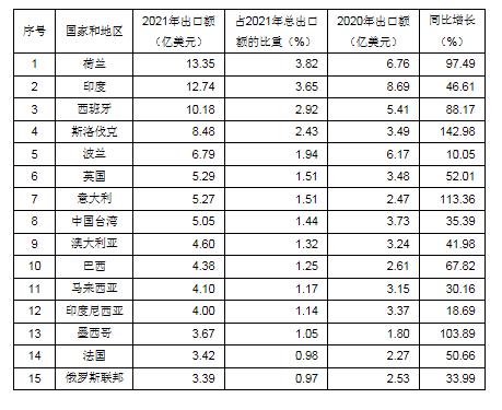 1、美國,2021年出口美國金額為56.60億美元,占中國總出口額16.20%,2020年出口美國金額32.11億美元,同比上漲76.27%。