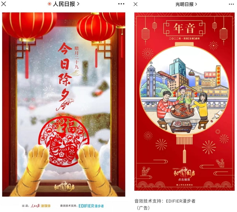 虎年辭舊迎新之際,國內著名音頻品牌漫步者聯(lián)合人民日報和光明日報,共同發(fā)布了主題為“動聽中國聲”的新春特別推送,以充滿節(jié)日氣氛的“圖文聲”并茂形式,配合漫步者特別調校后的動感音效,引發(fā)眾多消費者關注。