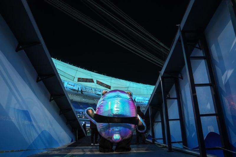 1月26日,在國家體育場(鳥巢)內(nèi),“冰墩墩”等待上場。新華社記者彭子洋攝