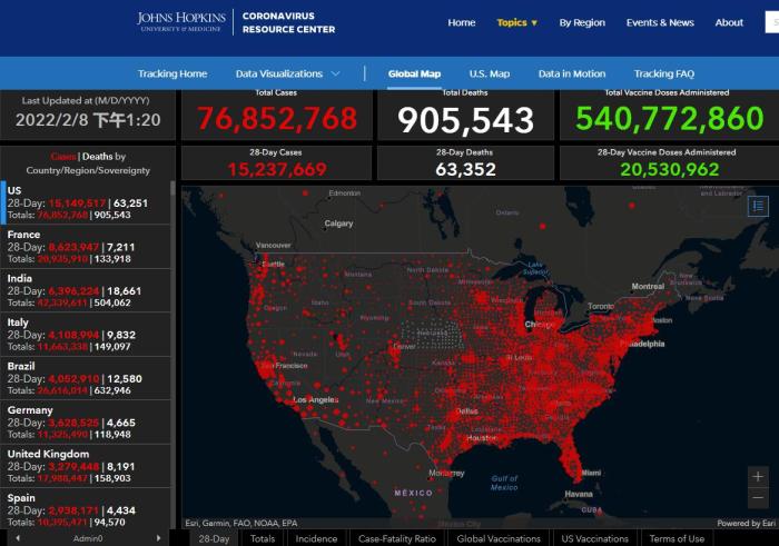 美國約翰斯·霍普金斯大學(xué)8日發(fā)布的新冠疫情最新統(tǒng)計數(shù)據(jù)顯示,截至美國東部時間8日17時21分(北京時間9日6時21分),全球累計新冠確診病例超過4億例,達(dá)400244031例,累計死亡病例5761208例。