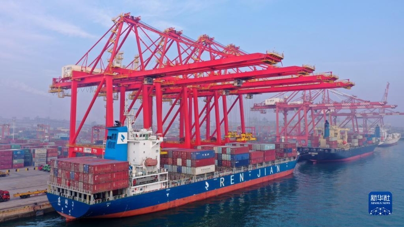 1月26日,貨輪停靠在山東日照港集裝箱碼頭進(jìn)行裝卸作業(yè)(無人機(jī)照片)。新華社記者 郭緒雷 攝