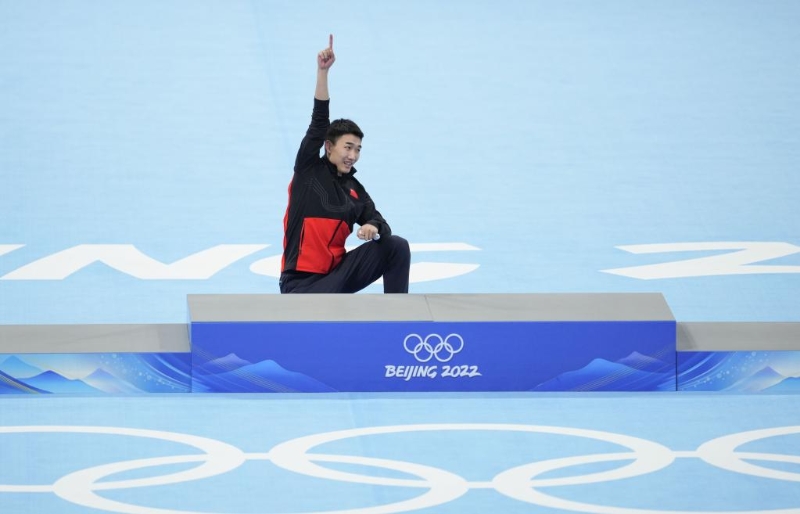2月12日,中國選手高亭宇在比賽后慶祝。新華社記者王建威攝