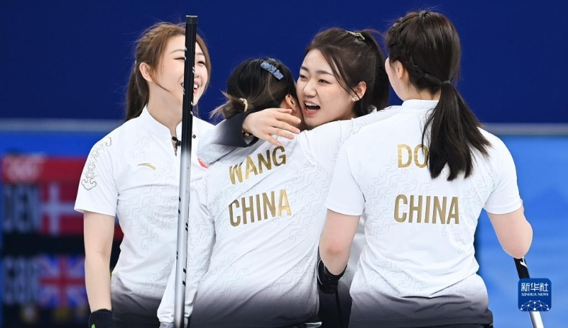 2月13日,中國隊選手在北京冬奧會冰壺女子循環(huán)賽后慶祝。新華社記者黃孝邦攝