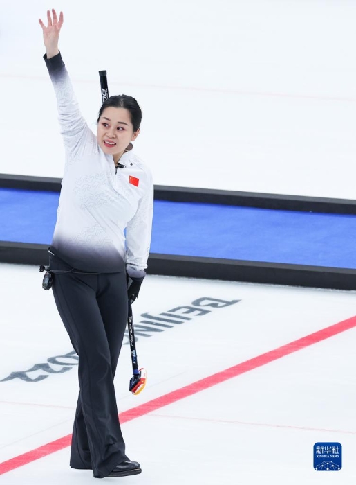 2月13日,中國隊選手王芮在北京冬奧會冰壺女子循環(huán)賽后向觀眾致意。新華社記者王婧嬙攝