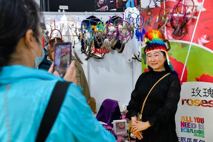 2021年9月6日,觀眾在2021中國(guó)國(guó)際服務(wù)貿(mào)易交易會(huì)首鋼園佩戴厄瓜多爾的特色工藝品拍照。