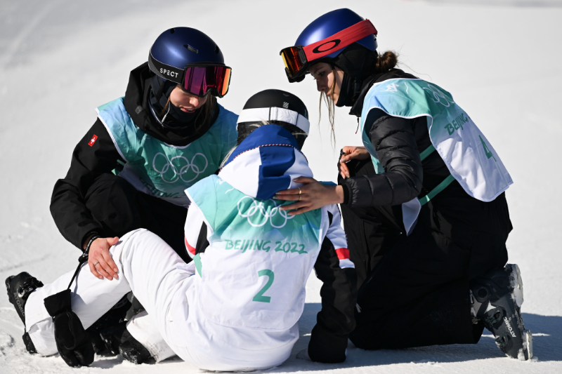 2月8日,谷愛(ài)凌(右)和瑞士選手瑪?shù)贍柕隆じ窭啄?左)在比賽后安慰法國(guó)選手苔絲·勒德。新華社記者薛宇舸攝