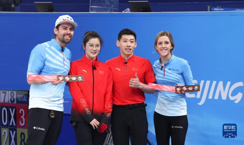 2月5日,范蘇圓(左二)、凌智(左三)與美國隊選手克里斯托弗·普利斯(左一)、維姬·佩辛格在賽后合影。新華社記者王婧嬙攝