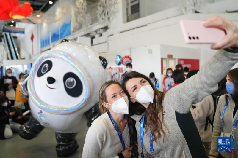 2月12日,北京冬奧會主媒體中心舉辦集體采訪活動,現(xiàn)場觀眾與北京2022年冬奧會吉祥物“冰墩墩”自拍。新華社記者鞠煥宗攝