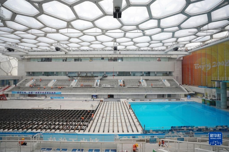 這是2019年7月10日拍攝的在進(jìn)行冰場可轉(zhuǎn)換結(jié)構(gòu)施工的“水立方”。新華社記者 鞠煥宗 攝