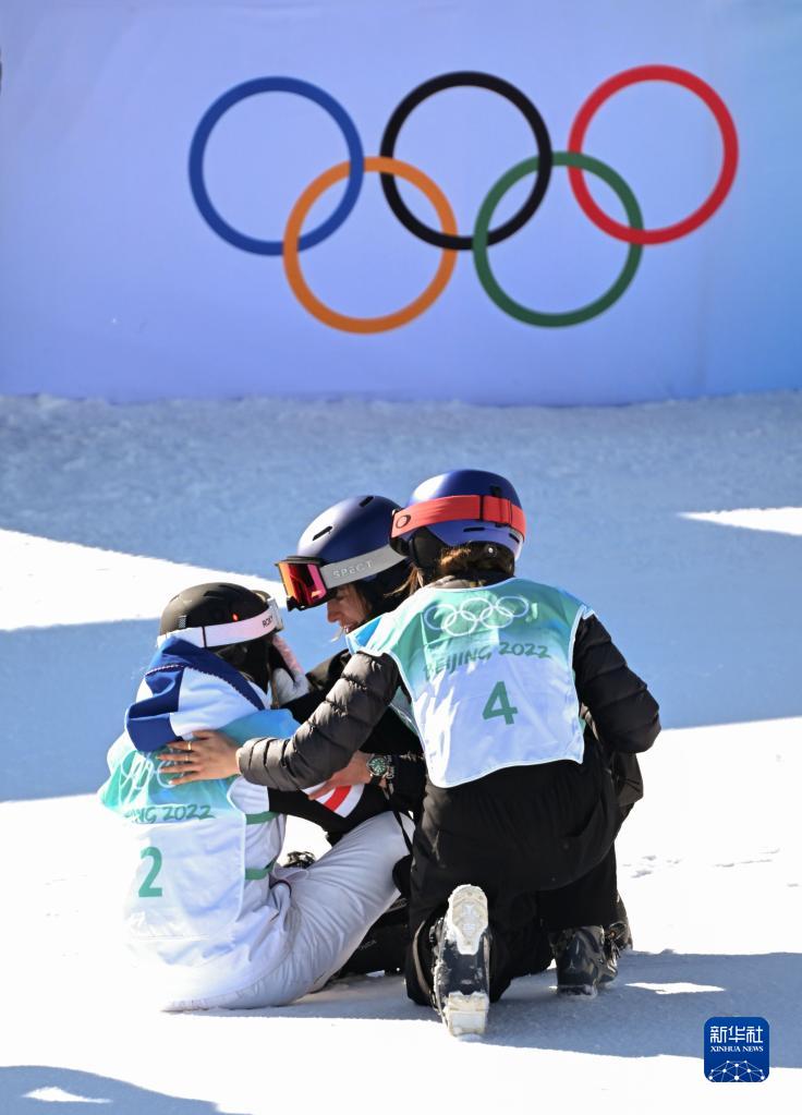 2月8日,中國隊(duì)選手谷愛凌(右)和瑞士隊(duì)選手瑪?shù)贍柕隆じ窭啄?中)在比賽后安慰法國隊(duì)選手泰絲·勒德。新華社記者 武巍 攝