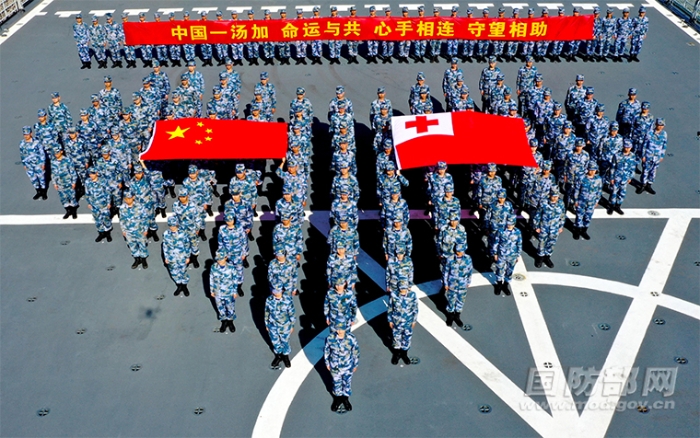 中國(guó)海軍海上運(yùn)輸編隊(duì)官兵為湯加送祝福。殷征 攝