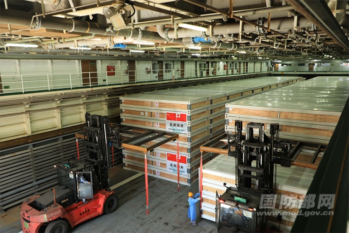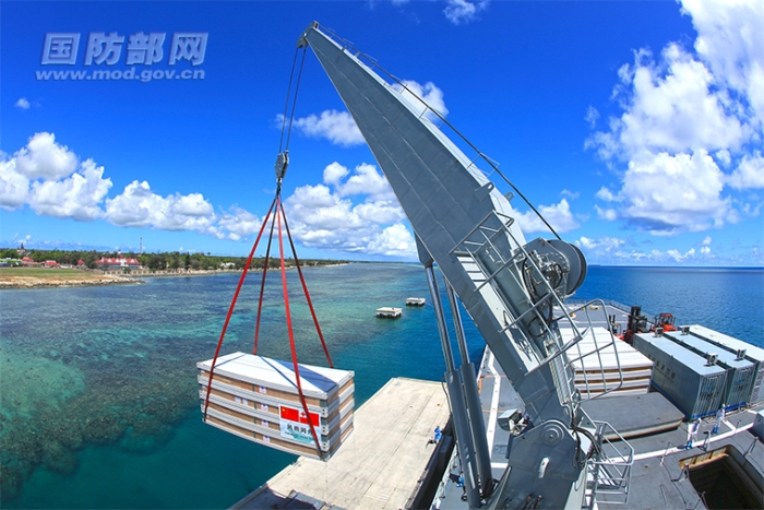 中國(guó)海軍海上運(yùn)輸編隊(duì)官兵裝載大件物資。薛成清 攝