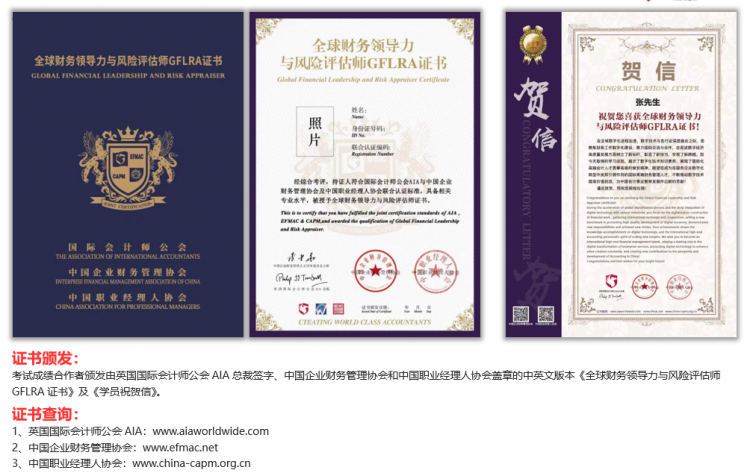 全球財務領導力與風險評估師(GlobalFinancialLeadershipandRiskAppraiser,簡稱GFLRA)證書由英國國際會計師公會AIA聯(lián)合中國企業(yè)財務管理協(xié)會與中國職業(yè)經(jīng)理人協(xié)會三方共同簽發(fā),是培養(yǎng)具有全球化視野的國際化高端財務管理人才項目,是國內(nèi)首個為企業(yè)財務領袖量身打造的全球培養(yǎng)計劃,全方位培養(yǎng)數(shù)字化新時代財務領袖。通過全球數(shù)字技術與財務專業(yè)的深度融合,促進企業(yè)全球化、數(shù)字化、智能化和專業(yè)化的財務轉(zhuǎn)型變革,培養(yǎng)中國財務管理者的全球領導力,提升戰(zhàn)略思維和風險評估的能力,強化合規(guī)和風險管理,加快推進企業(yè)數(shù)字化轉(zhuǎn)型,為企業(yè)在全球化可持續(xù)性發(fā)展中保駕護航!