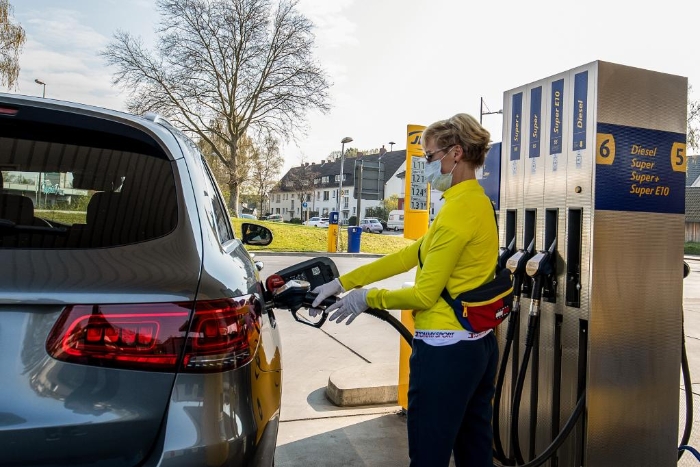 2020年4月9日,在德國(guó)施韋爾特的一處加油站,一輛車(chē)在加油。(新華社發(fā),約阿希姆·畢瓦勒茲攝)
