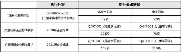都說:“一流企業(yè)做標準,二流企業(yè)做品牌,三流企業(yè)做產(chǎn)品”。為了持續(xù)滿足用戶的需求和期望,推動護童科技企業(yè)自身發(fā)展及學習桌椅行業(yè)整體技術水平和質量標準的提升,2021年護童科技又一次完善、提高了企業(yè)標準相關指標的要求:兒童學習桌方面,主要變化在于有害物質限量、結構和電氣安全、產(chǎn)品使用功能性能(如桌面傾斜、收納、輔件、尺寸)這些部分;兒童學習椅方面,除了與學習桌通用的有害物質限量和結構安全,主要聚焦在產(chǎn)品使用功能、性能和理化性能。標準修訂后,護童科技執(zhí)行的兒童學習桌椅企業(yè)標準指標共計275項,遠高于強制性的國家標準要求。