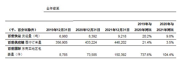 財報數(shù)據(jù)顯示,2021年百世集團營收(不含已轉讓的國內快遞業(yè)務)為人民幣114.26億元,同比增長8.5%;百世快運全年貨運量同比增長9.8%;百世供應鏈全年云倉訂單總數(shù)同比增長3.5%;百世國際在東南亞地區(qū)的全年包裹總量同比增長104.4%。