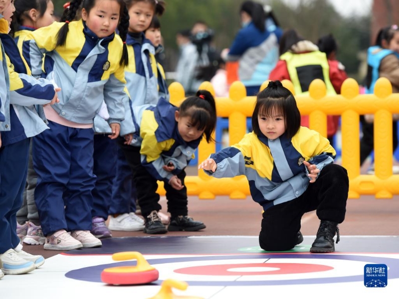2月16日,安徽省合肥市泰山路幼兒園的小朋友在開學(xué)典禮上體驗(yàn)“旱地冰壺”游戲。新華社記者 周牧 攝