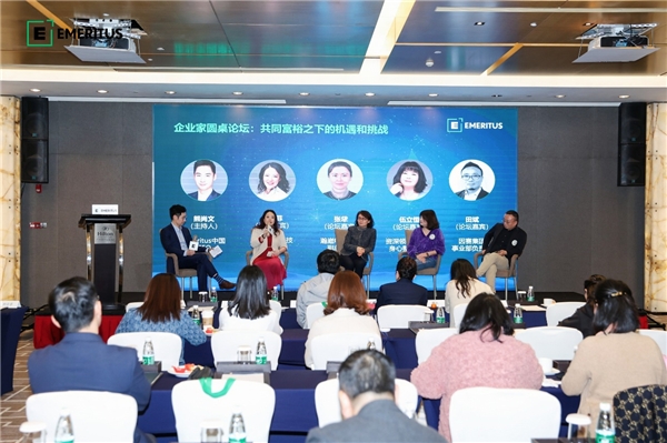 在圓桌論壇環(huán)節(jié),Emeritus中國CEO熊尚文邀請(qǐng)校友代表深圳飛伴科技創(chuàng)始人劉蕓菲、瀚崴電子五金副總經(jīng)理張牮、資深領(lǐng)導(dǎo)力教練身心整合導(dǎo)師伍立恒和因賽集團(tuán)事業(yè)部負(fù)責(zé)人田斌圍繞《共同富裕之下的機(jī)遇和挑戰(zhàn)》,從企業(yè)家角度如何掌舵展開探討。