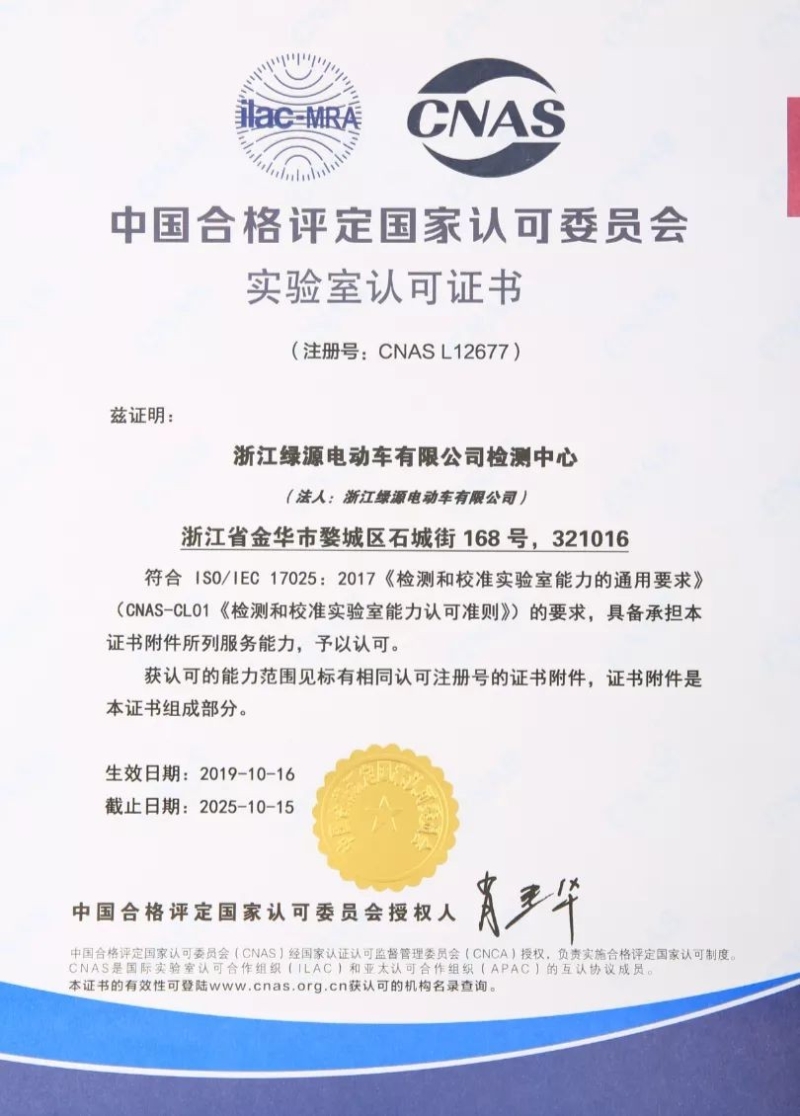 除了通過智能生產(chǎn)來提升產(chǎn)品質(zhì)量,電動車每一個部件也要接受綠源檢測中心最嚴苛的檢驗。綠源檢測中心成立于2008年,建筑面積6400㎡,實驗室面積共1650㎡,可對電動車211個大項,1191個小項進行嚴苛檢驗,覆蓋了電動車所有電氣部件,機械部件,金屬表面防護,油漆老化,防水防塵等級,整車性能等項目,綠源檢測中心已獲得中國合格評定國家認可委員會(CNAS)的實驗室認可證書,標志著綠源的檢測結果已經(jīng)實現(xiàn)國際互認。