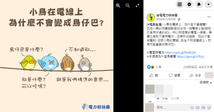 臺(tái)電6年前曾分享,小鳥(niǎo)在電線上,不會(huì)觸電的原因。 (圖/翻攝自臺(tái)電電力粉絲團(tuán))