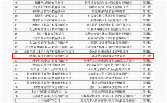 作為湖南省發(fā)改委認(rèn)定第一批擬建設(shè)培育產(chǎn)教融合型企業(yè),1+X第三批、第四批職業(yè)教育培訓(xùn)評(píng)價(jià)組織,金職偉業(yè)從“1+X證書”“教材研新”“教法提質(zhì)”“教師培養(yǎng)”“產(chǎn)教融合”“校企合作”“書證融通”等多個(gè)方面,推動(dòng)幼兒照護(hù)人才培養(yǎng)與發(fā)展,到目前為止,金職偉業(yè)已相繼入選廣西省、甘肅省、河北省2021年度職業(yè)院校教師素質(zhì)提高計(jì)劃的6個(gè)國家級(jí)培訓(xùn)項(xiàng)目,及江西省省級(jí)職業(yè)院校教師“1+X”證書試點(diǎn)培訓(xùn)基地,在師資培養(yǎng)方面取得出色成績。