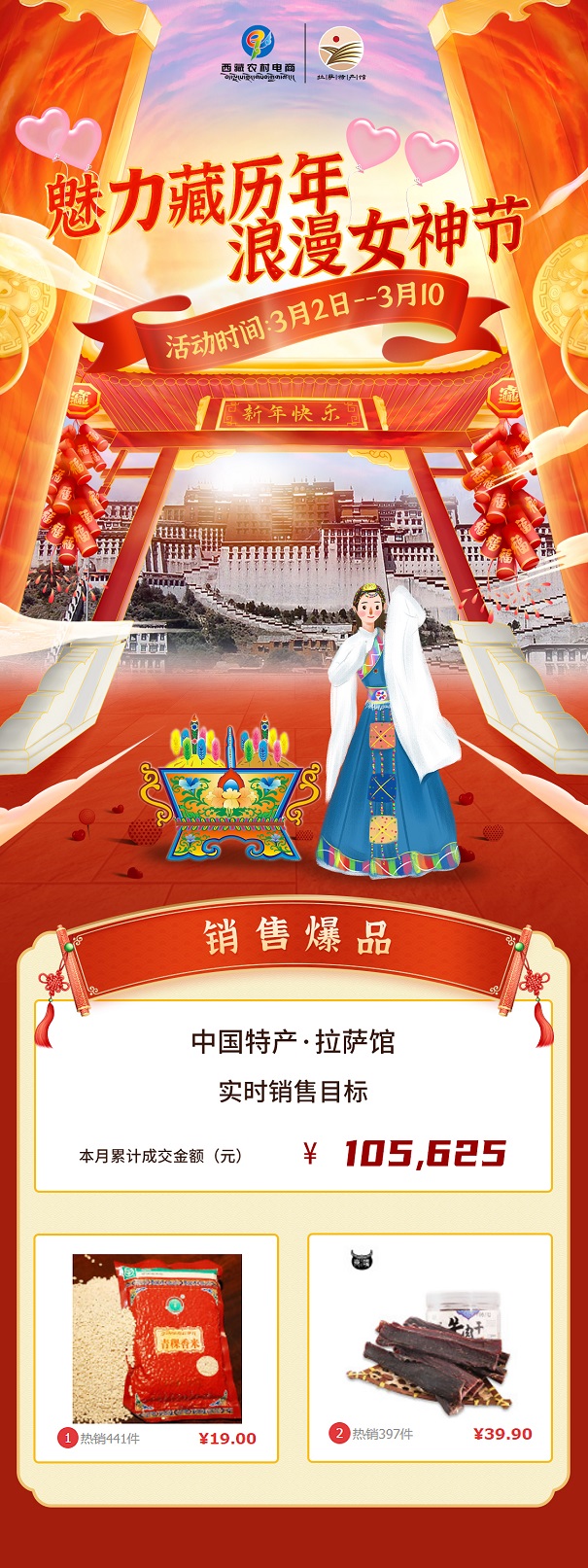 三八國際婦女節(jié),正好是藏歷新年正月初六,雙節(jié)同慶,我們中國特產(chǎn)·拉薩館跟隨者京東平臺,舉行了“魅力藏歷年 浪漫女神節(jié)”的活動(dòng),拉薩館緊跟鄉(xiāng)村振興的步伐,精選出7個(gè)地市的農(nóng)特產(chǎn)品,諸如西藏牛肉干,西藏奶制品,高原天然水,蜂蜜野生菌等,通過電商平臺帶動(dòng)西藏自治區(qū)農(nóng)特產(chǎn)品的銷售,一周時(shí)間,實(shí)現(xiàn)了10萬元的銷售,對助力鞏固脫貧攻堅(jiān)盡出自己的一份力量。