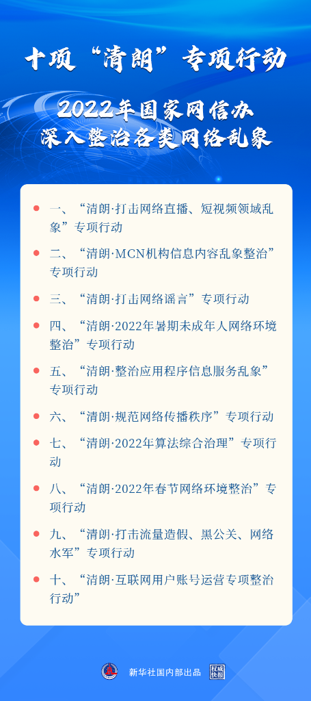 新華社北京3月17日電(記者王思北)記者17日從國(guó)新辦舉行的新聞發(fā)布會(huì)獲悉,2022年“清朗”系列專項(xiàng)行動(dòng)將重點(diǎn)開(kāi)展打擊網(wǎng)絡(luò)謠言,打擊網(wǎng)絡(luò)直播、短視頻領(lǐng)域亂象,算法綜合治理,暑期未成年人網(wǎng)絡(luò)環(huán)境整治等十方面任務(wù)。