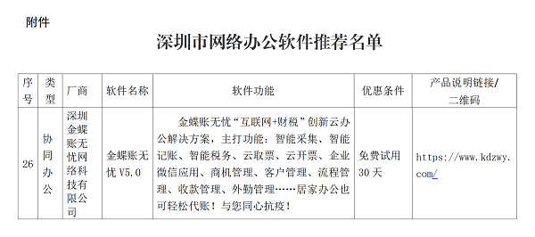 經(jīng)深圳市工業(yè)和信息化局動員組織下,金蝶賬無憂入選深圳工業(yè)與信息化局網(wǎng)絡辦公軟件名單,并積極配合國家、省、市有關疫情的防控工作,助力財稅服務企業(yè)實現(xiàn)高效遠程管理、有序在線辦公。攜手行業(yè)共抗疫,打贏疫情防控戰(zhàn)役、為穩(wěn)定經(jīng)濟社會大局提供有效的信息化解決方案。