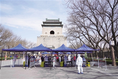 3月21日,在北京市東城區(qū)安定門街道鐘鼓樓文化廣場核酸采樣點(diǎn),醫(yī)護(hù)人員為居民進(jìn)行核酸采樣。 新華社記者 鞠煥宗 攝