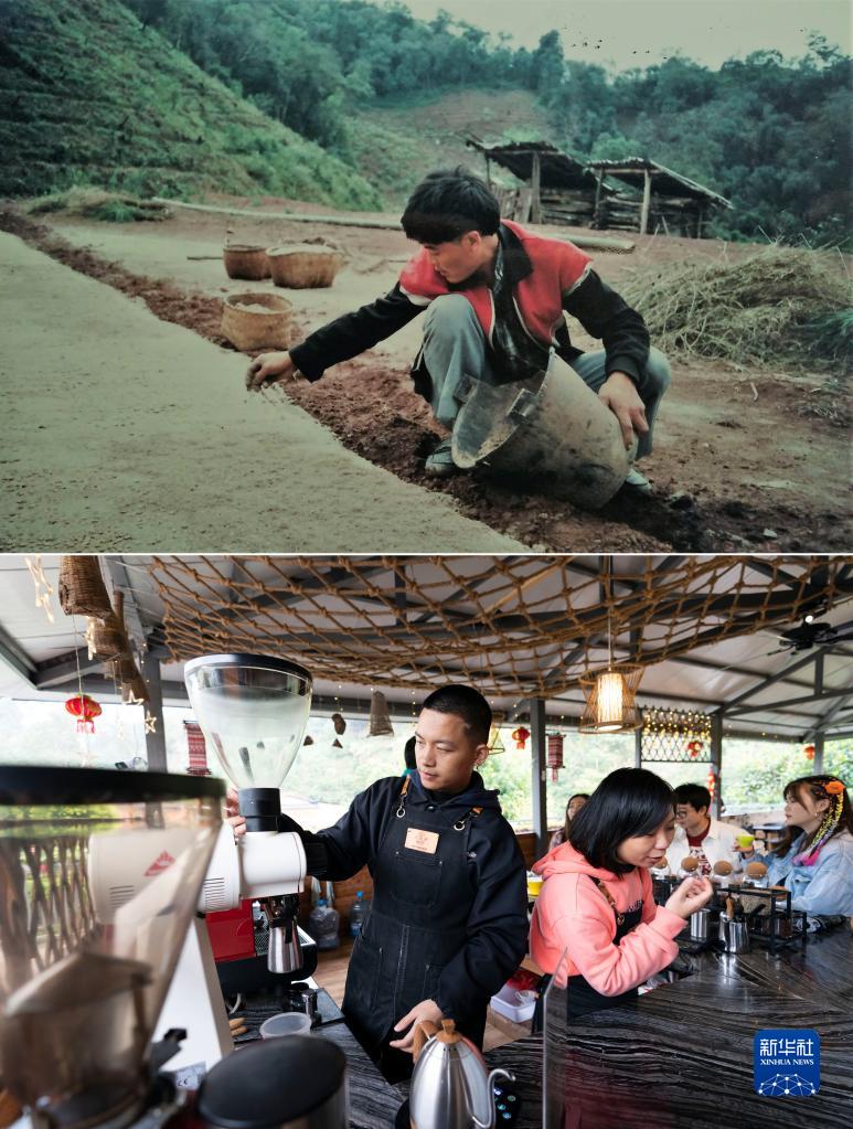 拼版照片:上圖為村民在云南普洱市思茅區(qū)小凹子咖啡莊園內(nèi)進行咖啡育苗(資料照片,1997年攝);下圖為咖啡師(左)在云南普洱市思茅區(qū)小凹子咖啡莊園內(nèi)制作咖啡(新華社記者陳欣波2月22日攝)。新華社發(fā)