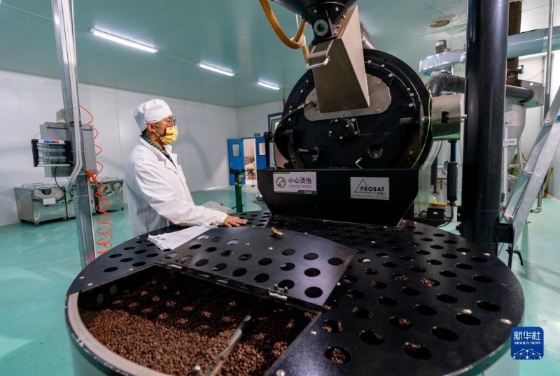 在云南普洱愛伲莊園咖啡有限公司內(nèi),工作人員在烘焙豆生產(chǎn)線上忙碌(2月22日攝)。新華社記者 陳欣波 攝