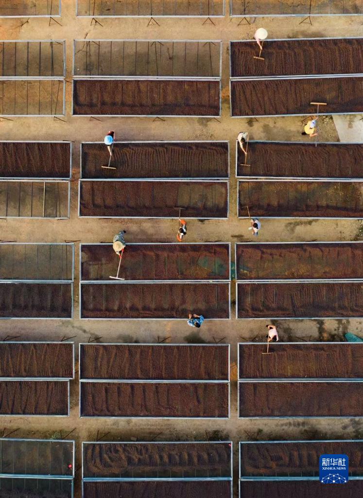 這是云南普洱市思茅區(qū)一家企業(yè)的咖啡曬場,工作人員在翻曬咖啡(資料圖片)。新華社發(fā)