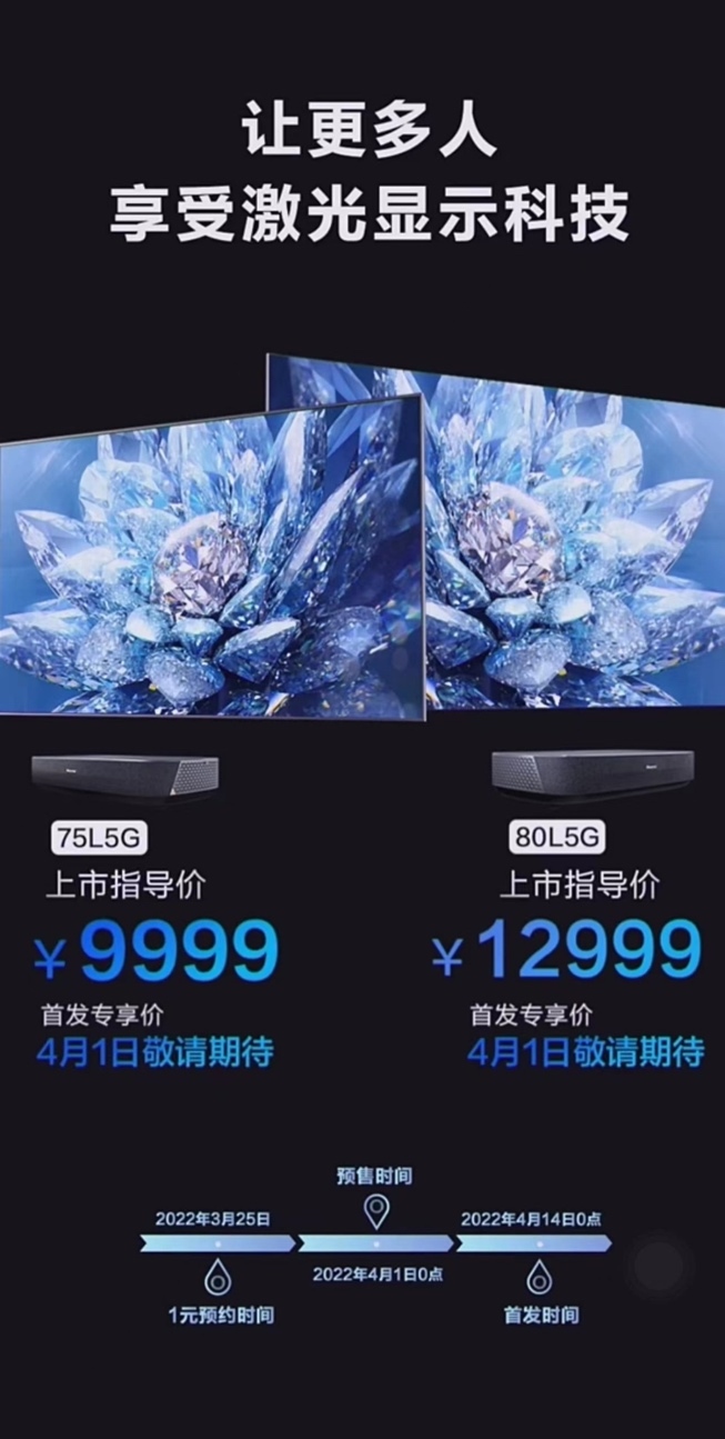 據(jù)介紹,全新海信激光電視L5G,75英寸上市指導(dǎo)價9999元;80英寸上市指導(dǎo)價12999元。3月25日起,海信京東自營旗艦店已開啟1元盲約。而在4月1日,海信還將公布首發(fā)專享價,釋放更大福利。