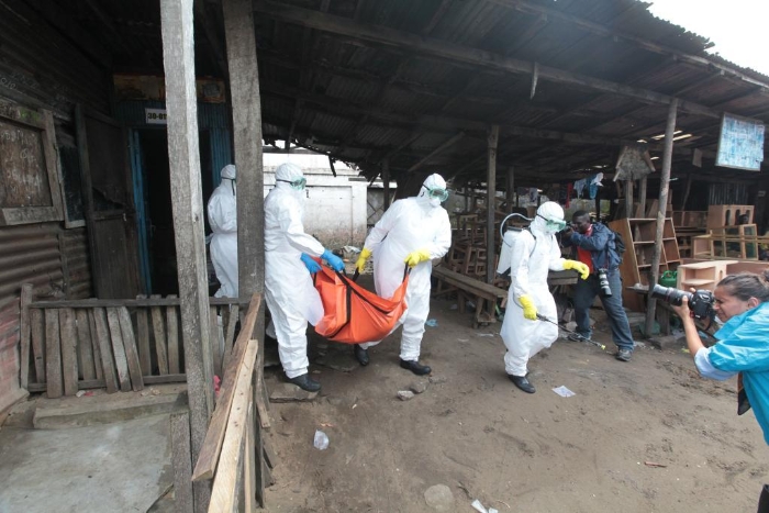 2014年10月14日,在利比里亞首都蒙羅維亞,工作人員將感染埃博拉病毒死亡者的尸體帶離居民區(qū)。(新華社發(fā))