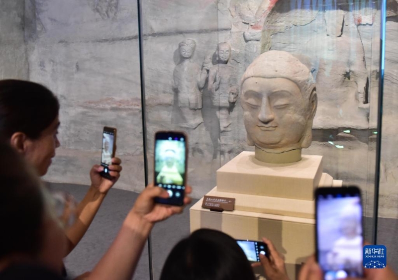 在太原市天龍山石窟博物館,參觀者在拍攝回歸的天龍山石窟“第8窟北壁主尊佛首”(2021年7月24日攝)。新華社記者 柴婷 攝