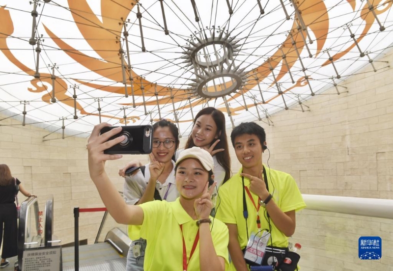 參加交流活動(dòng)的香港青年(后排)在四川金沙遺址博物館陳列館有“太陽(yáng)神鳥”圖案的房頂前與志愿者(前排)合影留念(2019年8月25日攝)。新華社記者劉坤攝